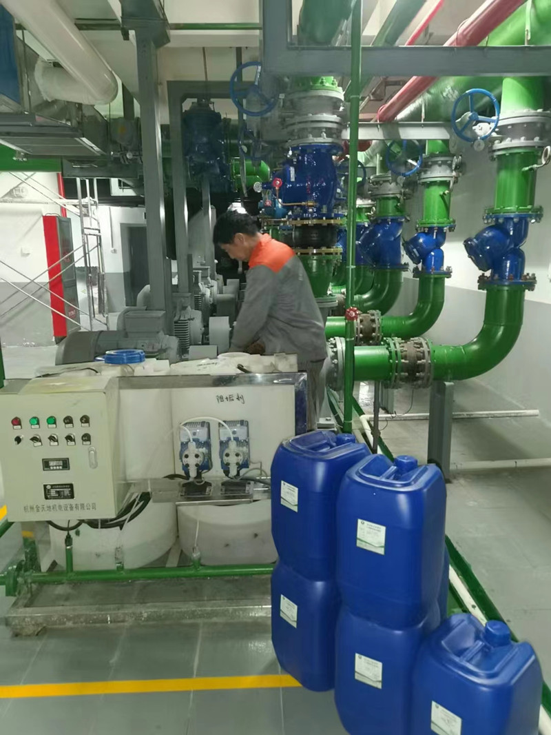 中央空調(diào)冷凍水系統(tǒng)的水垢一般為生物粘泥和銹泥等軟垢,在清洗水垢時,我們是這樣使用中央空調(diào)清洗劑的:在膨脹水箱中先加入GJ-殺菌粘泥剝離劑,比例為保有水量的0.5%左右,開泵循環(huán)清洗,夏天循環(huán)24小時,冬天循環(huán)60小時后排放,然后加入GJ-中央空調(diào)中性清洗預(yù)膜劑,比例為保有水量的2%左右,開泵循環(huán)清洗8-12天,藻類、生物粘泥、銹泥會分解脫落,隨水排出,清洗預(yù)膜同時完成,置換清水后即可,而且運行清洗期間不影響正常使用。