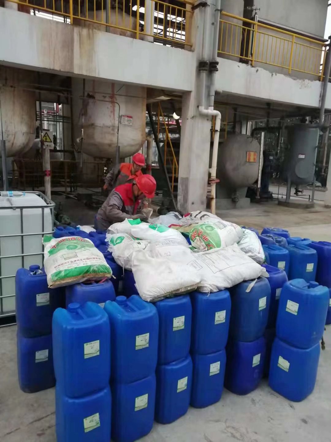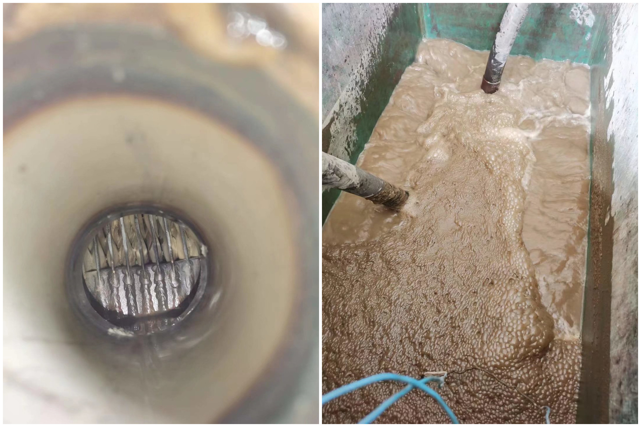 現(xiàn)場察看,板式換熱器結(jié)垢嚴重,板換流道大部分堵塞,很多粘粘的軟垢附著于設(shè)備上,為了提高洗凈度,并加快清洗速率,技術(shù)員選用了GJ-2B殺菌粘泥剝離劑先對軟垢進行徹底的清除,后再用GJ-2E除銹除垢劑進行對硬垢的清除,兩遍清洗下來后,廢液排入清洗槽中,槽內(nèi)廢液混濁不堪,可見板式換熱器結(jié)垢的程度有多嚴重。
