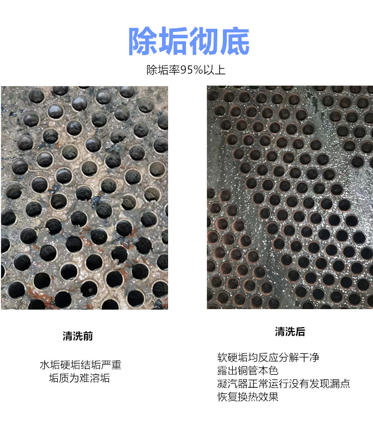 施工斷續(xù),1天后,電廠凝汽器在線化學(xué)清洗另一側(cè)完成,結(jié)束整個(gè)清洗工程。銅管附著的軟硬水垢均已反應(yīng)分解干凈,標(biāo)準(zhǔn)金屬腐蝕試片監(jiān)測(cè)腐蝕率正常,凝汽器正常運(yùn)行也沒(méi)有發(fā)現(xiàn)漏點(diǎn)。此設(shè)備結(jié)垢類(lèi)型為難溶垢,每年一次,已連續(xù)清洗五次??蛻魧?duì)我公司清洗技術(shù)和清洗效果均表滿意。