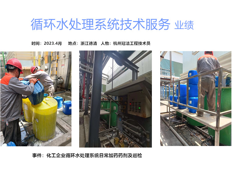 分別給循環(huán)水處理系統(tǒng)投加GJ-殺菌滅藻劑和GJ-KF緩蝕阻垢劑,給冷凍水系統(tǒng)投加GJ-MB緩蝕阻垢劑,倒入加藥桶,并調整加藥時間,由加藥裝置自動控制加藥量,一切就緒,轉下一家藥企進行循環(huán)冷卻水處理技術服務。