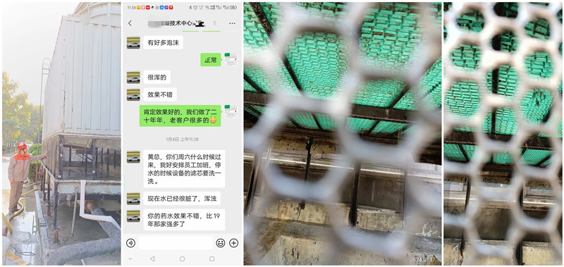 在第一次加了GJ-2B殺菌粘泥剝離劑幫助清洗生物粘泥軟垢循環(huán)了三天后,第二次加了GJ-中性運行水垢清洗劑進行循環(huán)清洗預(yù)膜,循環(huán)10天后,第三次加了GJ-中性運行清洗預(yù)膜劑用于在金屬表面形成致密保護膜。用戶直夸獎效果不錯,冷卻塔填料結(jié)垢也洗干凈了,和新的一樣,換熱器效果也恢復(fù)了正常。